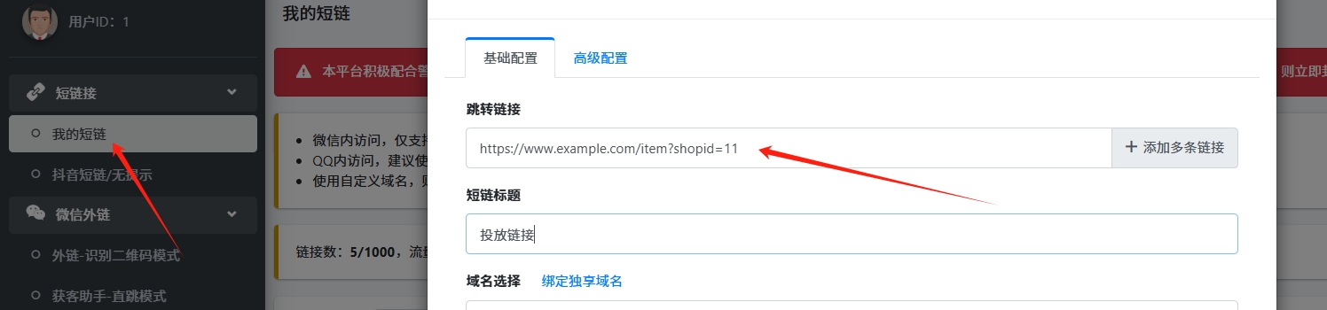 1. 把您的原始链接是https://www.example.com/item?shopid=11(仅为举例,请替换成自己真实链接),先通过【我的短链】功能生成短链