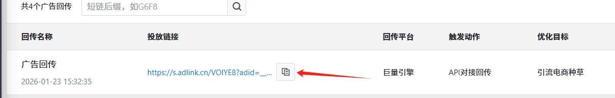 4. 复制广告回传链接,例如https://s.adlink.cn/VOlYE8?adid=__AID__&creativeid=__CID__&creativetype=__CTYPE__&clickid=__CLICKID__&projectid=__PROJECT_ID__&promotionid=__PROMOTION_ID__,把里面的clickid参数手动替换成任意值如test11_001