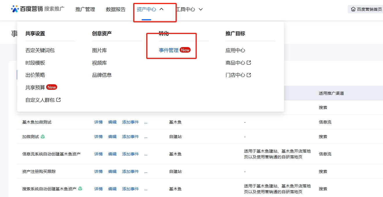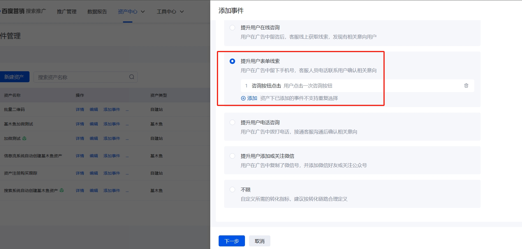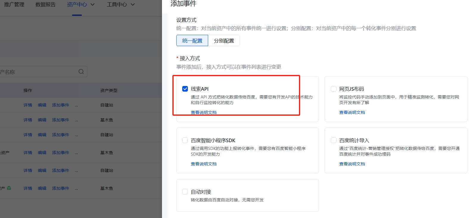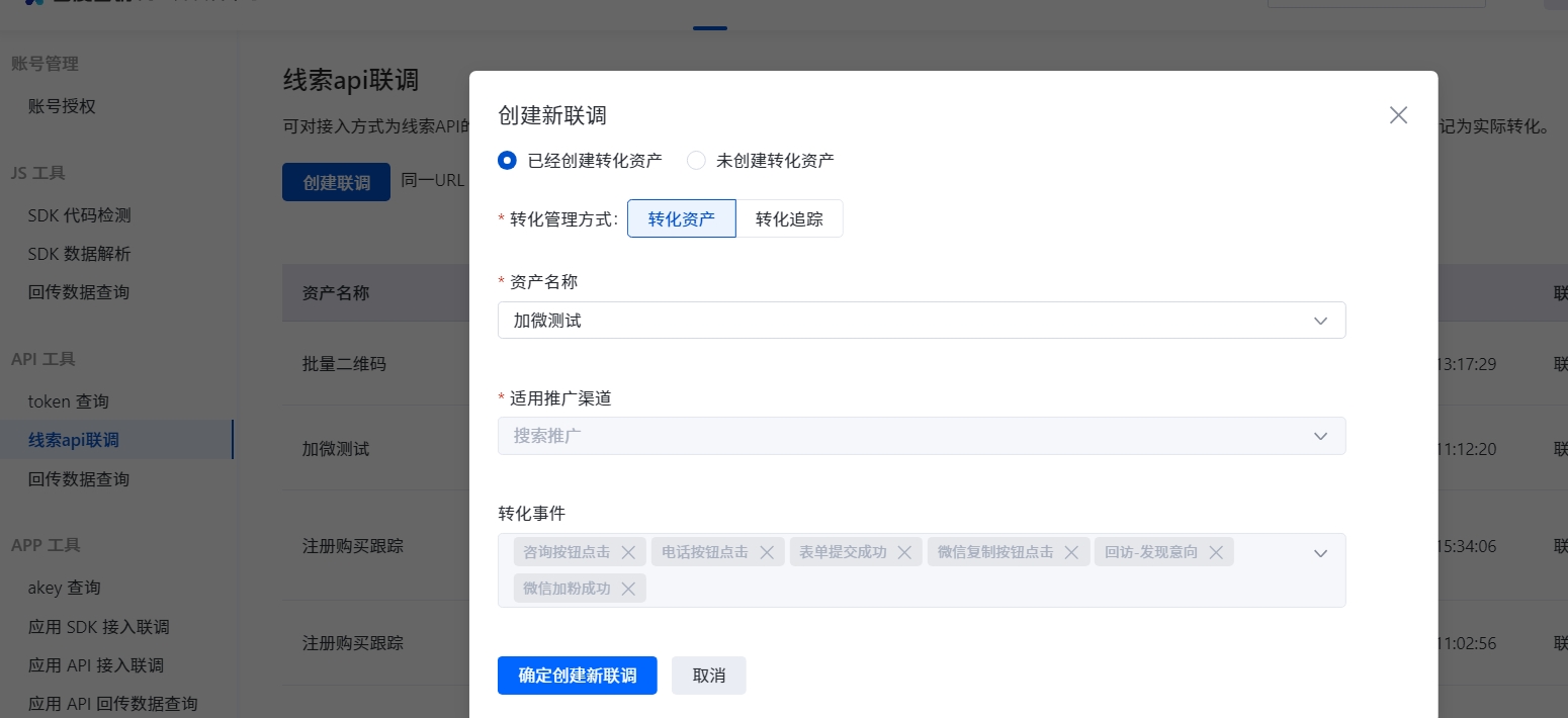 选择【转化事件】,确保和【管理后台】的回传事件保持一致;选择【线索API】