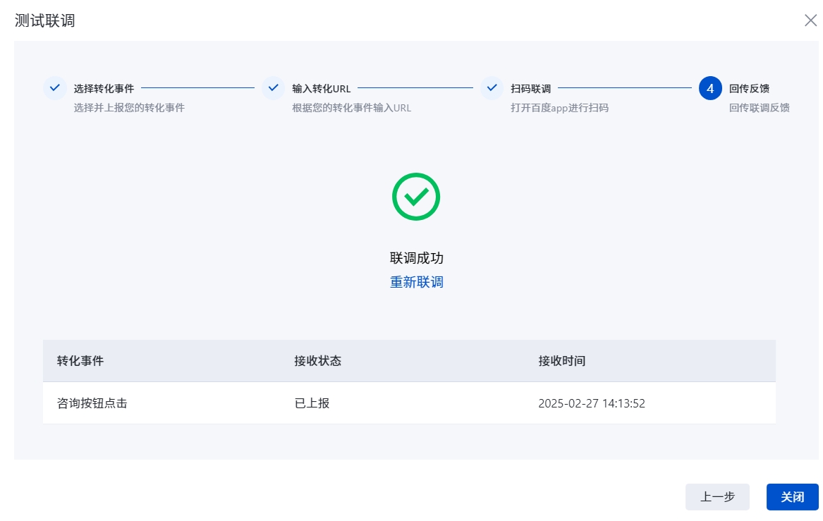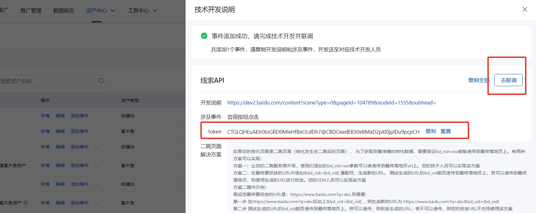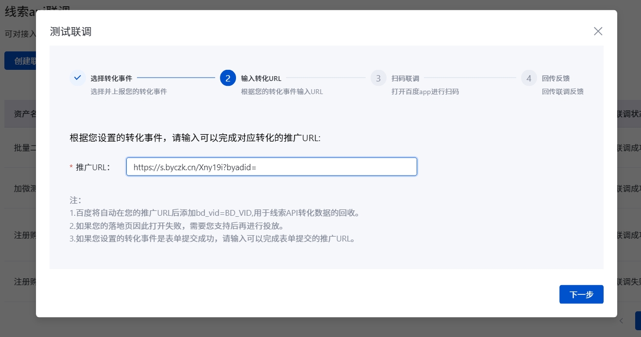 输入落地页的链接,按百度指示完成联调,确保【联调成功】指示