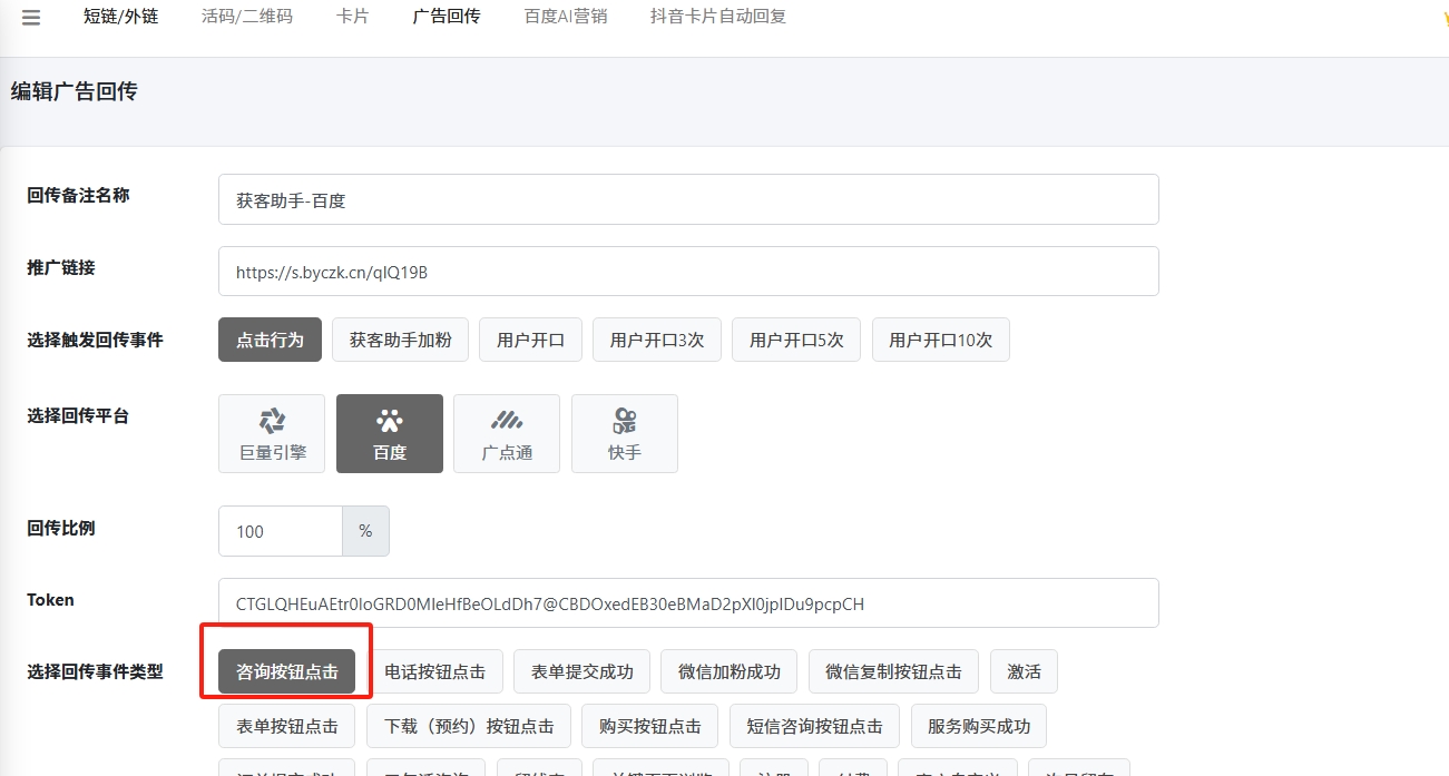 【选择回传事件类型】这里确保和百度后台选择一样即可,例如选择【咨询按钮点击】