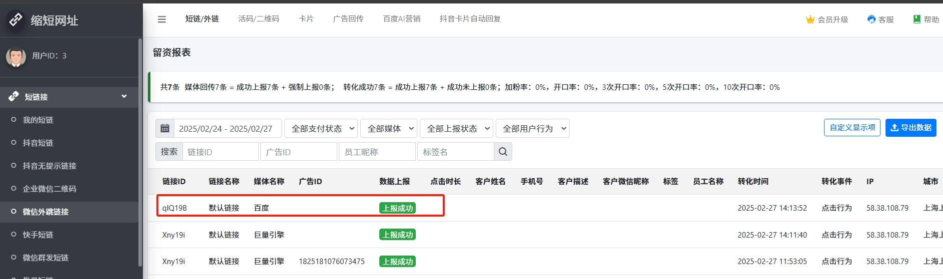 3.回到管理后台,选择【短链】-【专属设置】-【留资报表】,可以看到刚才测试的线索已经回传成功